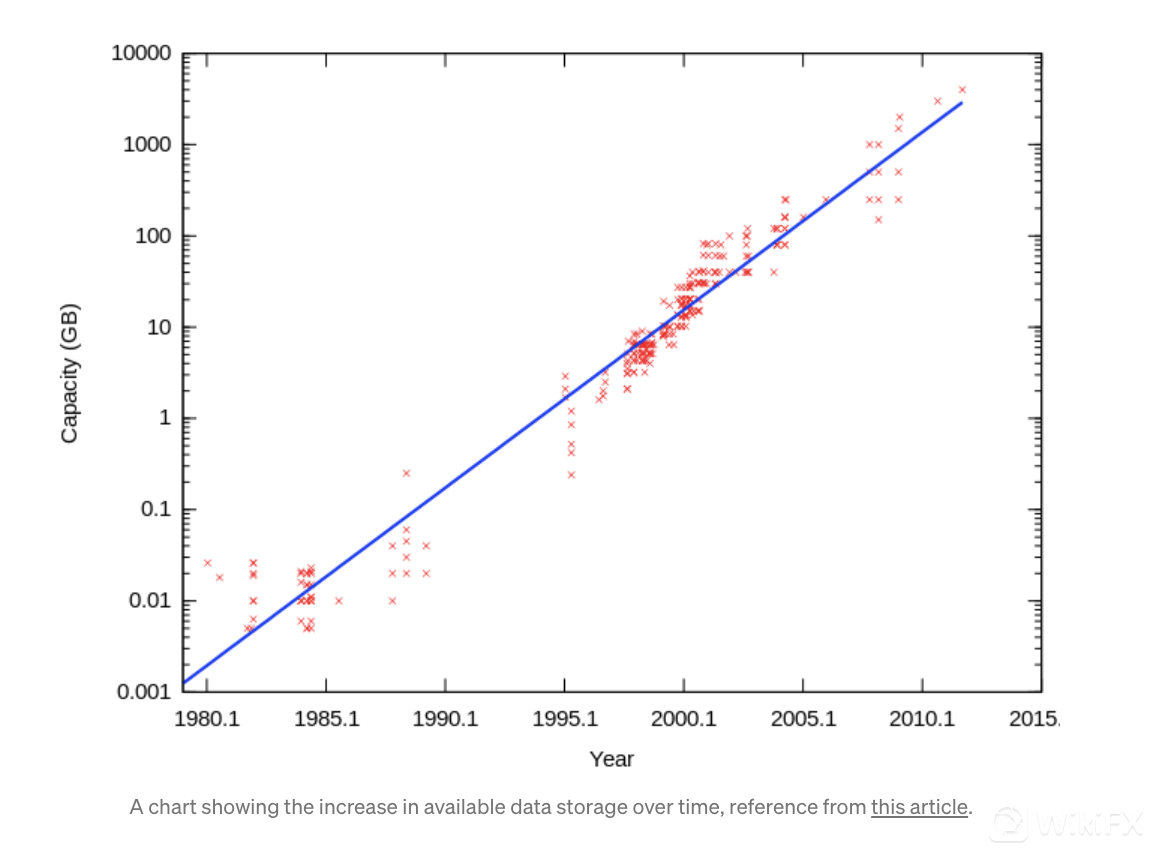 计算能力并不是2021年有利于算法交易技术进步的唯一原因。数据存储与计算能力同样具有显著的影响。就在过去的40年里,我们观察到我们的数据存储水平在不断地线性增长。