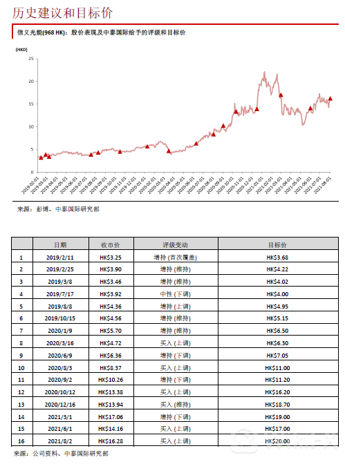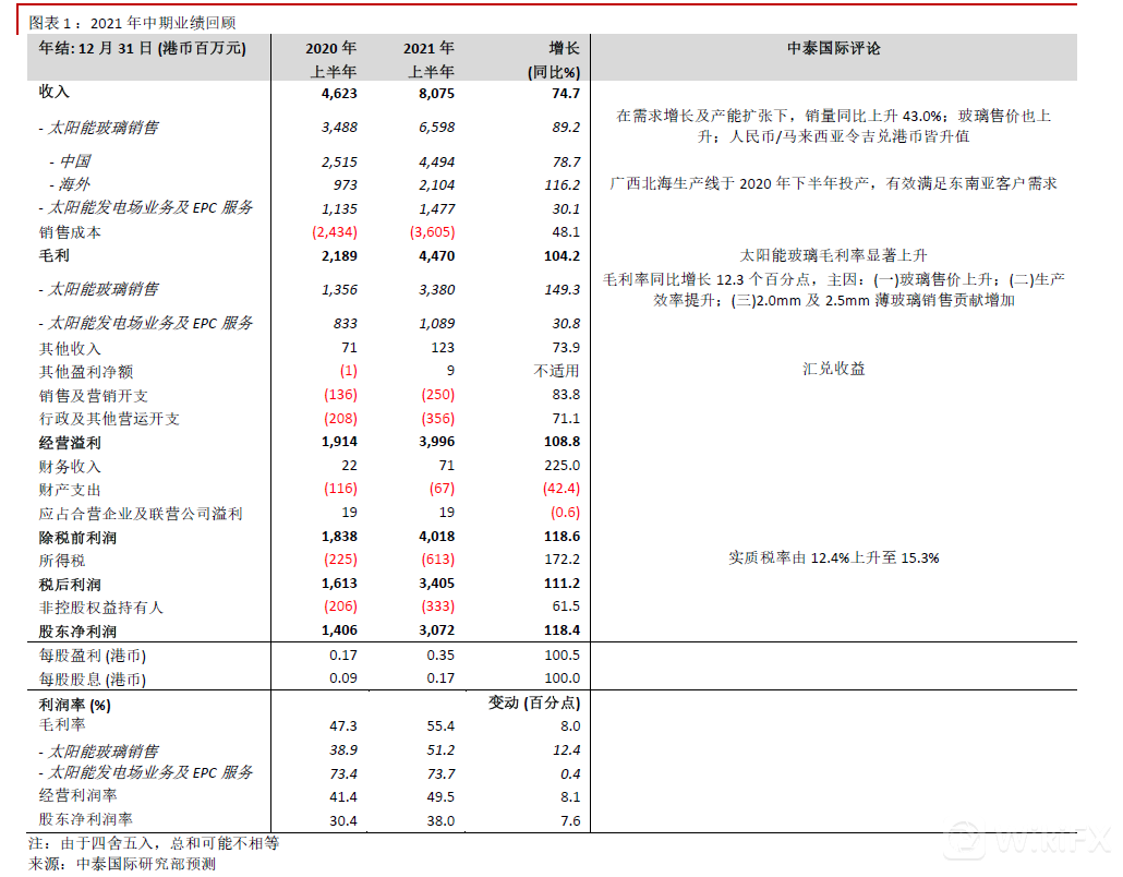 公司昨日公布理想的2021年中期业绩,股东净利润同比上涨118.4%至30.7亿元港币(同下),接近公司盈喜预测增长120.0% 上限(见图表1),主因:(一)在需求增长及产能扩张下,光伏玻璃销量同比上升43.0%;(二)光伏玻璃价格上升提升收入及毛利率。今年上半年3.2mm光伏玻璃市场均价同比增长约14%。公司总毛利率则同比增长8.0个百分点至55.4%;(三)广西北海光伏玻璃生产线于2020年下半年投产,有效满足东南亚客户需求;(四)人民币及马来西亚令吉兑港币皆升值。