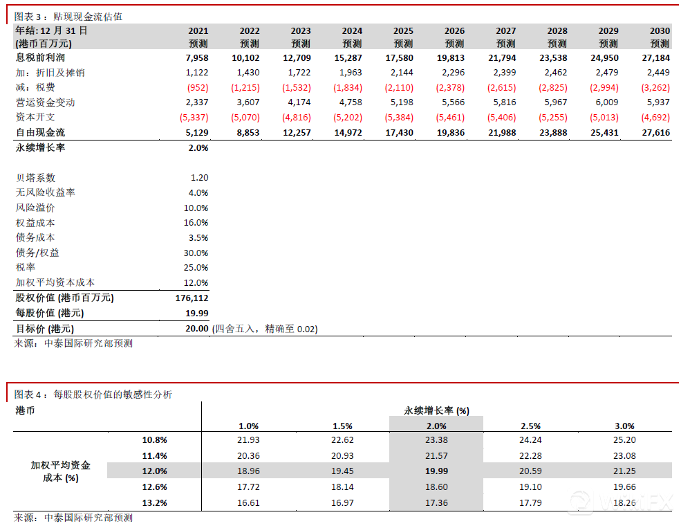 我们相应将贴现现金流(DCF)分析推算的目标价由17.00港元调升17.6%至20.00港元(见图表3-4),这对应22.7倍2022年市盈率和22.9%上升空间。我们重申“买入” 评级。