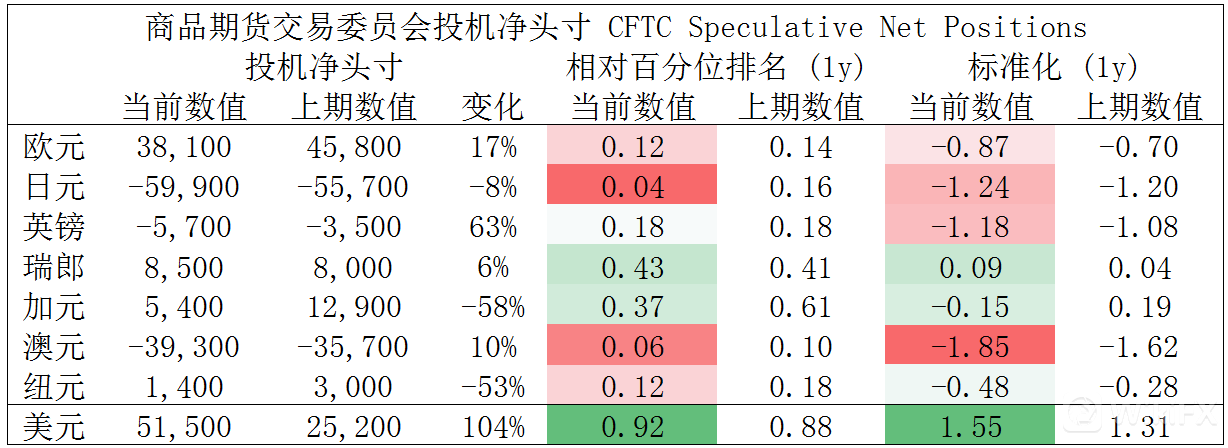 CFTC资金流数据显示,澳元、日元空头处于极值,因此,预计短期随着资金流入并支持其回涨,另外,美元多头也处于极值。