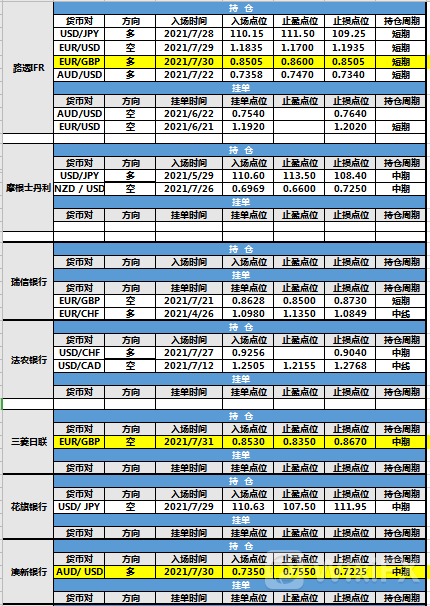 持仓方面,三菱日联、路透IFR两投行仓位调整。三菱日联欧元兑英镑入场点位调整至0.8530,止盈点位调整至0.8350,止损点位调整至0.8670,目前处于持仓中。路透IFR欧元兑英镑止损点位调整至0.8505,目前处于持仓中。