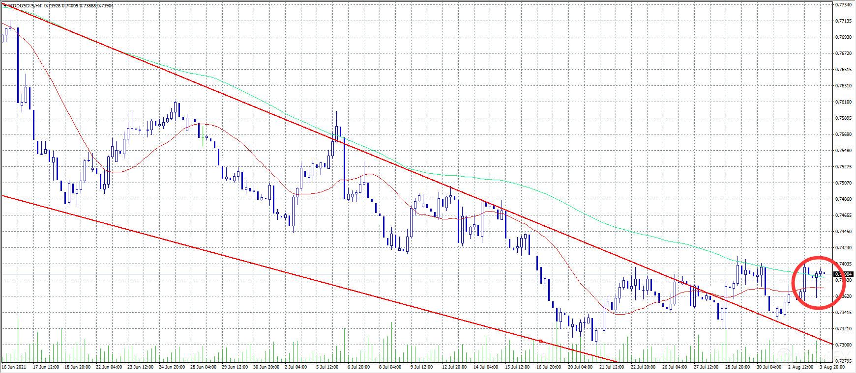 昨日,澳储行表示,仍将维持其缩减债券购买规模的计划,令澳元走强,虽然悉尼的长期封锁将导致本季度经济陷入萎缩。澳储行预测2022年的经济增长率将略高于4%,高于之前预测的3.5%。另外,到2023年底,失业率将降至4%,这将接近充分就业水平。日线图显示,澳元/美元连续两日上涨,但未延续上涨,尚能突破0.7400水平。目前汇价窄幅盘整。
