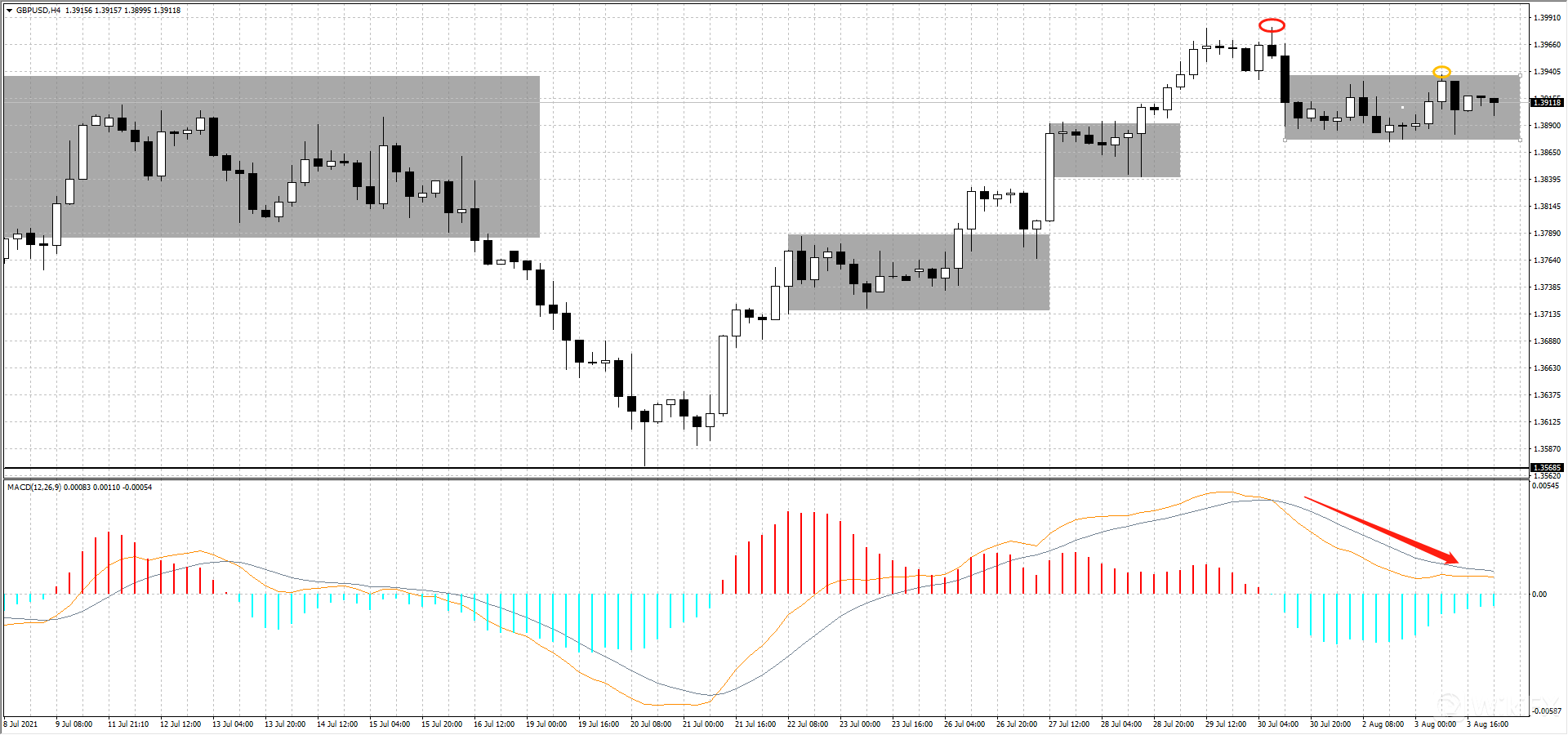 英镑4小时图上看, 昨日最高触及1.3937(如图黄圈处),仍处于在1.3931-1.3874(如图阴影处)之间窄幅震荡,与前一高点 1.3982比较价格下跌MACD双线下行,目前有个短线的下跌回调,可以考虑短线在1.3930附近做空并设置止损1.3982。