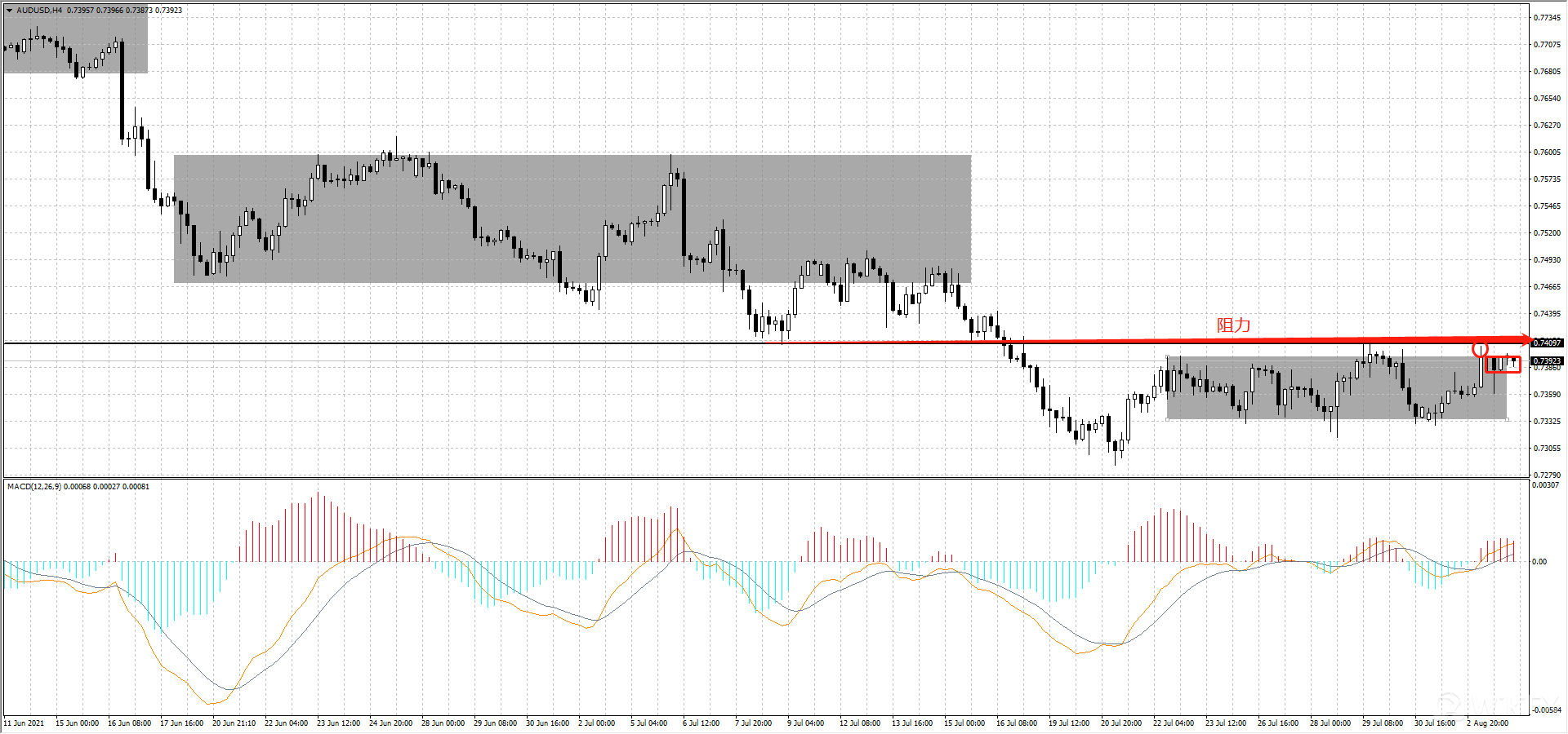 澳元4小时图上看,目前仍在0.7396-0.7329箱型整理区间震荡,昨日最高触及0.7407(如图红圈处)受到上行阻力未能成功突破,目前在箱型整理区间上沿震荡(如图红框处)会再次试探阻力位0.7408,目前以先观望为主。
