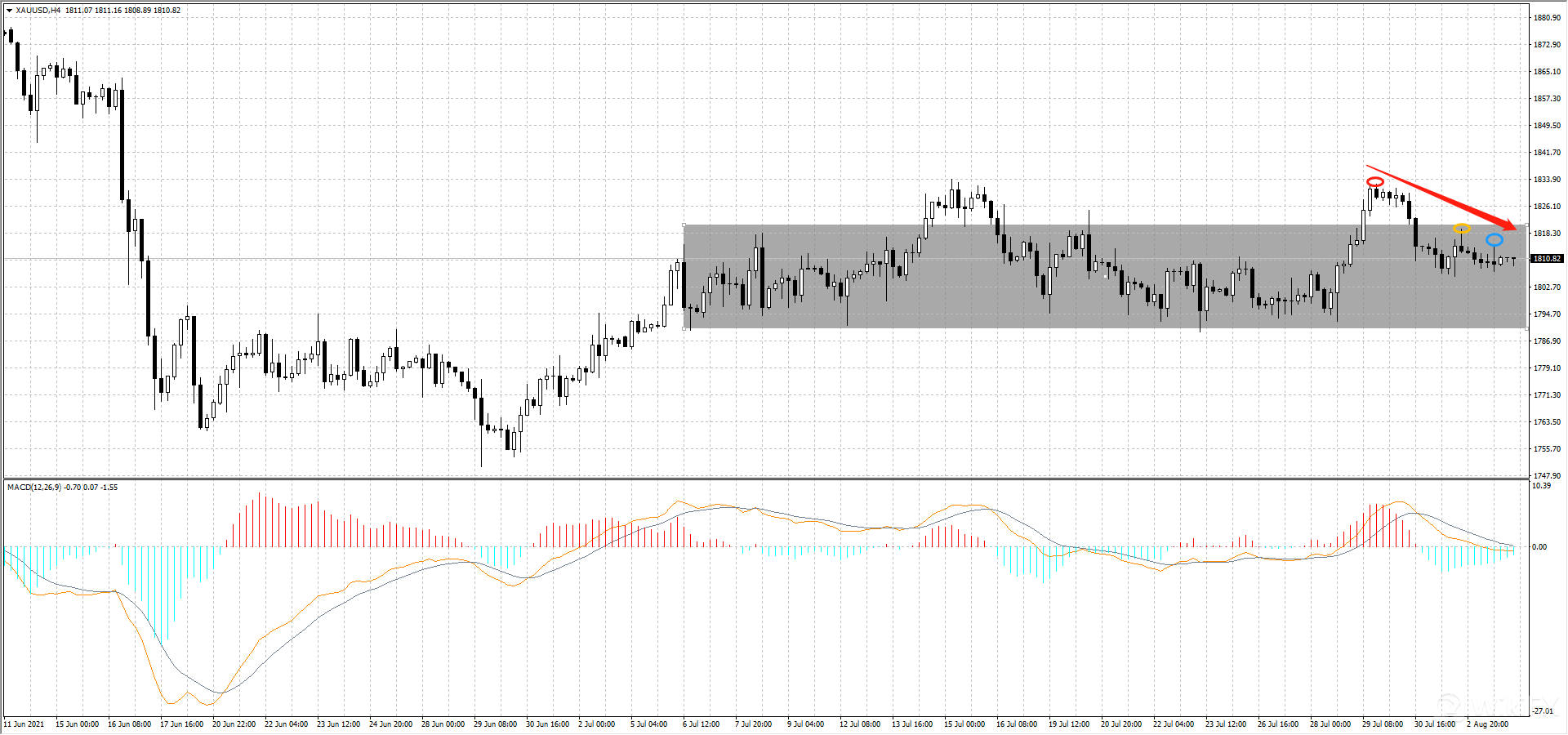 黄金4小时图上看,目前仍在 1818-1790箱型整理区间震荡,昨日最高触及 1814.94(如图蓝圈处)与前两高点1832.57(如图红圈处)与1819.47(如图黄圈处)呈现高点下移之势,短线看会继续向箱型整理区间下沿1790附近运动,可以箱型整理区间上下沿为止损位置制定策略。