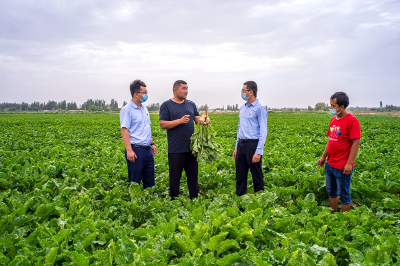 近年来,农发行新疆喀什地区伽师县支行积极扶持当地甜菜特色种植产业发展,累计向奥都糖业放贷2.97亿元,支持企业以“公司+基地+农户”模式,发展甜菜种植20万亩,带动周边2万农户稳定增收,助力乡村振兴。图为该行工作人员在甜菜种植基地了解甜菜生长及资金使用情况。 本报记者 刘志良 通讯员 潘战昊 摄