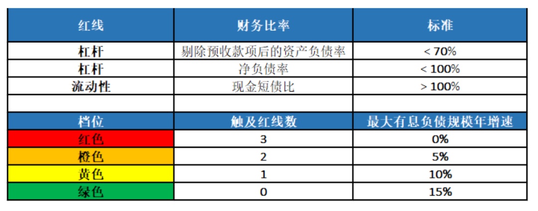 “三条红线”:剔除预收款项后的资产负债率、净负债率和现金短债比