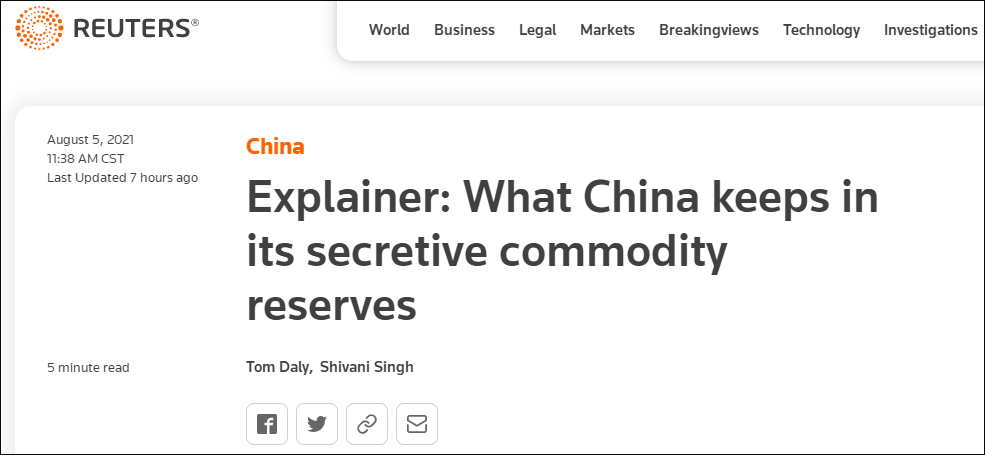 8月5日,英国路透社发布题为《中国的秘密商品储备中都有些什么》解读文章称,近日,中国10年来首次投放了部分战略金属储备,试图抑制伤及制造商的价格涨势。中国还投放了煤炭和进口玉米储备,以抑制价格,同时中方还购进猪肉以支撑市场。