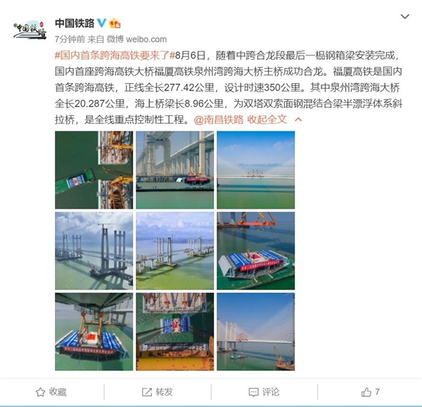 8月7日消息,中国铁路官方微博宣布,由中国铁建(601186,股吧)铁四院设计的新建福(州)厦(门)高铁泉州湾跨海大桥6日成功合龙,这标志着国内首条跨海高铁福厦高铁全线的关键控制性节点打通,中国高铁即将迈入跨海时代。