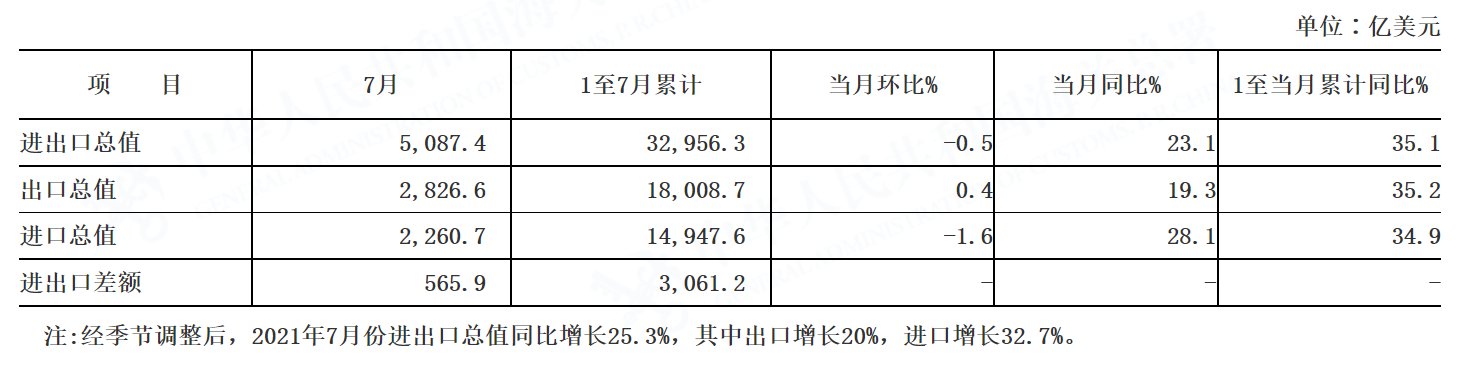海关数据显示,7月我国进出口总值5,087.4亿美元,同比增长23.1%;出口2,826.6亿美元,同比增长19.3%;进口2,260.7亿美元,同比增长28.1%。贸易顺差为565.9亿美元。财联社近日“C50风向指数”调查显示,市场预计7月出口同比增速18.3%;进口同比增速31.3%;贸易顺差504.4亿美元。