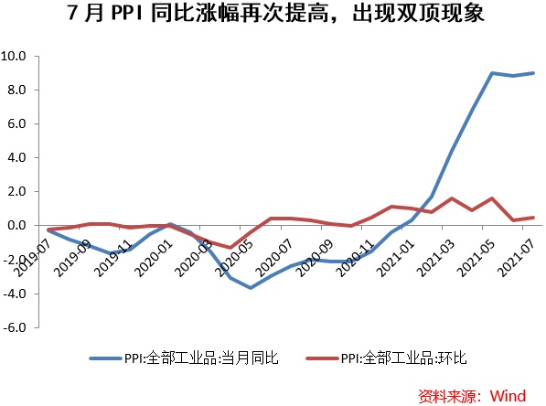 7月份PPI(工业生产者出厂价格指数)同比上涨9.0%,环比上涨0.5%;工业生产者购进价格同比上涨13.1%,环比上涨0.9%。1-7月平均,工业生产者出厂价格比去年同期上涨5.7%,工业生产者购进价格上涨7.9%。