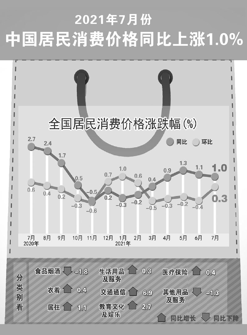 7月CPI环比涨幅由下降0.4%转为上升0.3%,同比上涨1%,涨幅较上月回落0.1个百分点。
