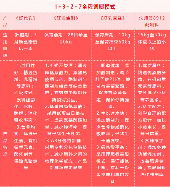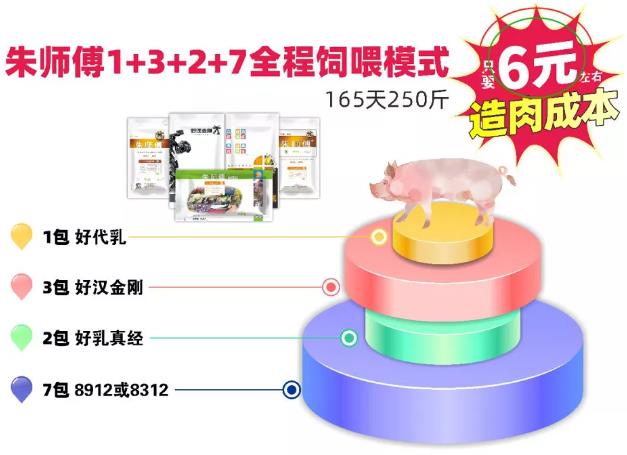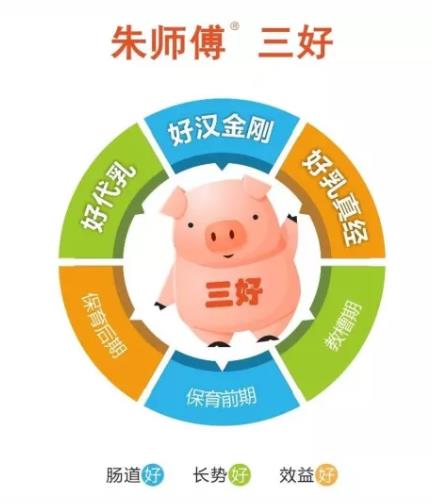 《好代乳》《好汉金刚》《好乳真经》完美结合,形成全新的“三好”大保育营养解决方案。整个教保阶段采用朱师傅的“三好”大保育模式,猪的应激更低、生产性能更好,仔猪单位增重的饲料成本还可以再节省10%以上。再加上朱师傅8912配制料,形成一套成熟的“1+3+2+7”全程饲喂模式,从根本地帮助客户实现降本增效。