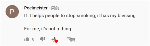这条视频下方点赞量第一的评论认为:如果它能帮助人们戒烟,我会送上我的祝福。