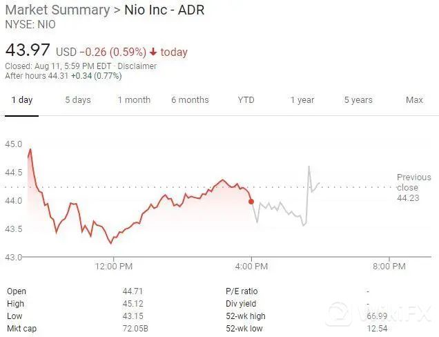 蔚来周三盘中最深跌2.4%,尾盘一度转涨,最终收0.6%,报43.97美元。由于二季度营收同比翻倍、每股亏损大幅收窄,但整体毛利率小幅低于预期,股价盘后跌1%后转涨。