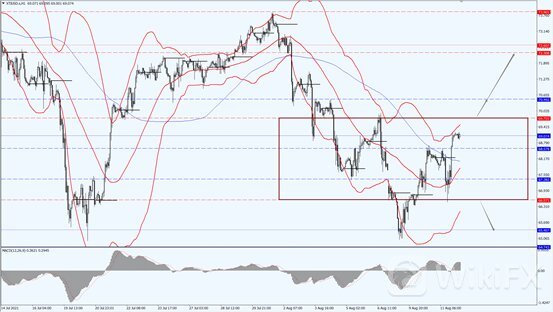 昨日原油按照预期回测至 66.57 一线企稳后大幅拉升,至此,油价进入 66.57 到 69.75 区间的横盘震荡阶段,应关注油价对 66.57 到 69.75 区间的突破方向,如果向上突破 69.75 一线,则将打开进一步的上行空间,届时依次 70.49 和 72.30 两个位置的压制力度;如果向下跌破 66.57 一线,则将打开进一步的下行空间,届时将再次测试 65.40 一线的支撑力度。