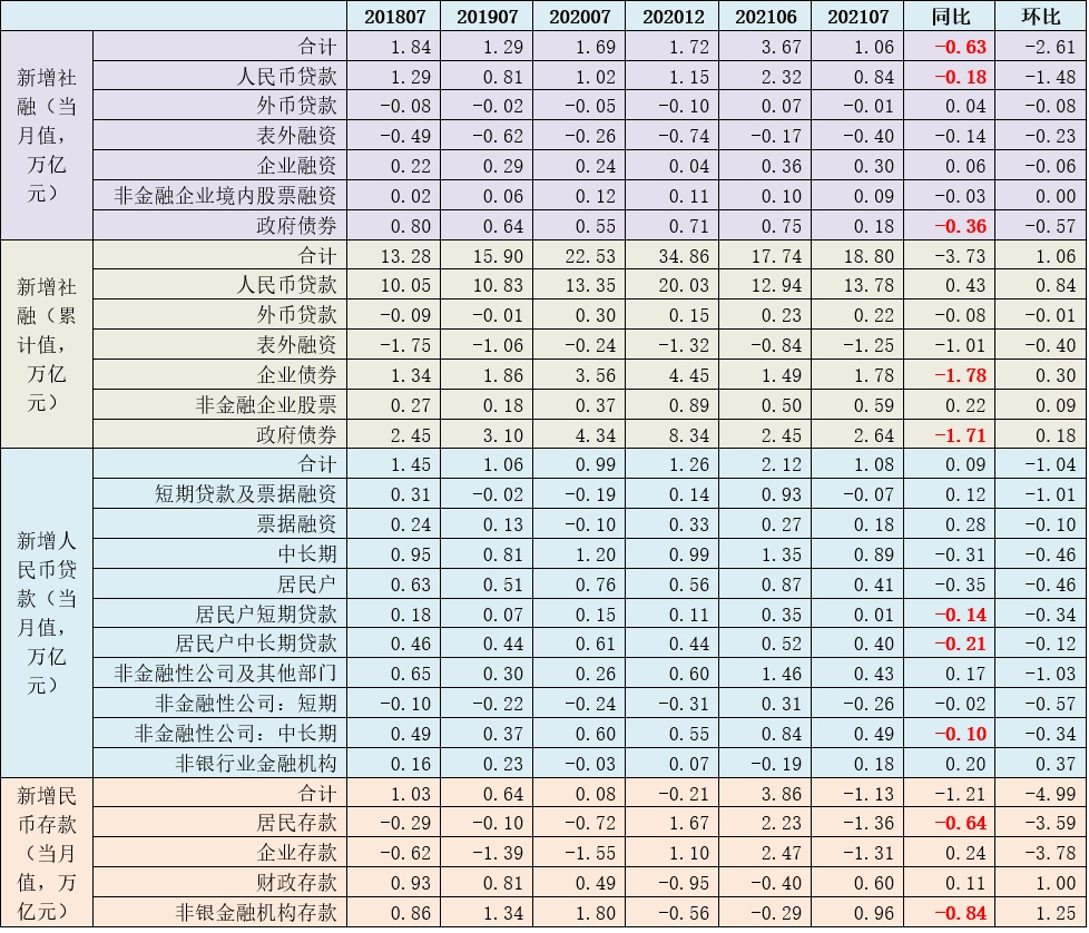 2021年7月,新增社会融资规模达到1.06万亿,同比和环比分别大幅少增0.63万亿和2.61万亿。其中,新增人民币贷款、新增未贴现票据和新增政府债券同比分别少增0.18万亿、0.12万亿和0.36万亿,三者合计共拖累社融少增0.66万亿,可以看出政府债券拖累最为明显,主因应是政府发行节奏放缓。