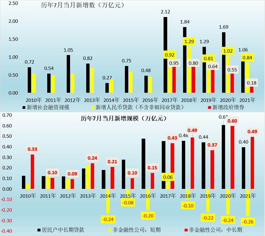 那么央行短期内会不会放松政策来支撑社融呢?我们认为央行可能还会观察一段时期,再等等看。因为从央行的视角来看,今年1-7月新增社融和新增人民币贷款分别达到18.80万亿和13.78万亿,虽然较2020年同期分别少增-3.73万亿和多增0.43万亿,但较2019年同期仍分别多增2.90万亿和2.95万亿,因此绝对值上看似乎并不低。现在市场可能更关心的是,监管政策层面会不会有所放松?如地产和城投政策层面,目前来看这种可能性应该是存在的,虽然不会允许新增,但基于存量债务化解的信贷支持应该是有商量空间的,毕竟若实体经济出现流动性危机,届时再出手拯救的难度会大幅提升。