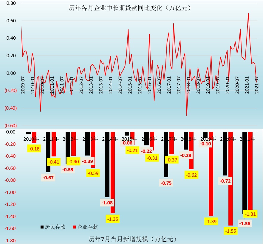 2021年7月,企业中长期贷款新增0.49万亿,同比少增0.10万亿,这是自2020年2月以来,企业中长期贷款同比首次出现少增。由于企业中长期贷款代表着企业主动扩大产能的意愿,这意味着目前企业主动生产的意愿并不强,资金可能已经出现脱实向虚的迹象,值得政策部门关注。