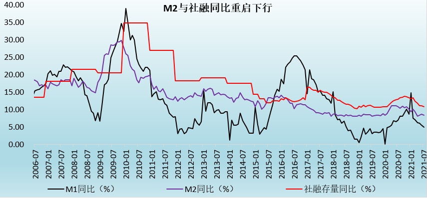 虽然M1、M2与社融同比已经回落到潜在经济增速附近,且后续财政政策发力以及政府债券发行节奏加快虽可以在一定程度上支撑社融,但监管环境仍趋严的背景下,地产调控节奏很难有明显变化,居民中长期贷款改善空间不大,预计实体经济融资需求亦将继续处于弱势、难有明显改善,基于此判断后续几个月社融收缩态势仍将延续。