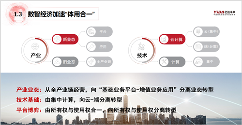 如果说知识与科技为“体”,那么我们要看到这一本体所带来的实际“功用”或是“效用”,要力求“体用合一”。从产业发展、技术发展及平台发展来看,数字经济均助其实现了从“合一”到“分离”;倡导和践行数智经济加速的“体用合一”是实现数智化的重要环节。我们立足产业业态,要基于全产业链经营平台,实现“基础业务平台至增值业务应用”的分离业态转型;立足技术基础,要从集中计算,转变为向云端分离转型;立足平台博弈,要实现自所有权与使用权合一,向所有权与使用权分离转型。