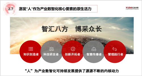 有一种生产要素在数智化发展中的每一个环节都必不可少,那就是“人”,“人”是资源流动的主要动因,资源是随着人在进行流动。“人”为产业数智化可持续发展提供了源源不断的内核动力。那么,如何定义“人”在数智化发展过程中的巨大贡献呢?我做出如下归纳,即人是知识的创造者、是科技的研发者、是创新的开拓者、是智慧的传播者、更是管理的践行者,我们应基于“以人为本”的思想以智汇八方、博彩众长,将“人”的力量发挥到极致!
