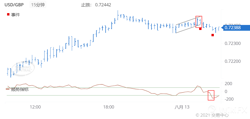 通过,于2021年 8月 13日(GMT时间02:30)CCI向下穿越-100%水平线,进而触发了利空信号。