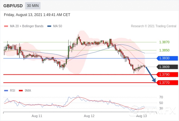 在 1.3830 之下,看跌,目标价位为 1.3790 ,然后为 1.3770 。