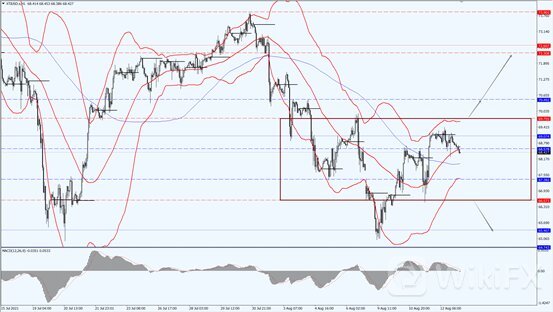 昨日原油高位横盘震荡,因此,油价依旧处于 66.57 到 69.75 区间的横盘震荡阶段,应继续关注油价对 66.57 到 69.75 区间的突破方向,如果向上突破 69.75 一线,则将打开进一步的上行空间,届时依次 70.49 和 72.30 两个位置的压制力度;如果向下跌破 66.57 一线,则将打开进一步的下行空间,届时将再次测试 65.40 一线的支撑力度。