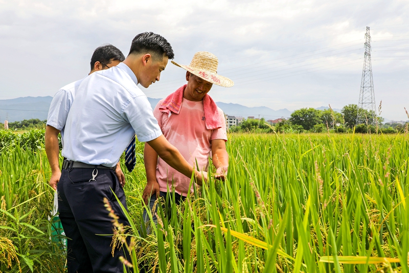 邮储银行浙江金华市分行积极创新金融产品和服务,扎根农村、服务农业、贴近农民,努力打通农村金融服务“最后一公里”。截至7月末,该行涉农贷款余额249.58亿元。图为该行工作人员在走访当地水稻种植农户。