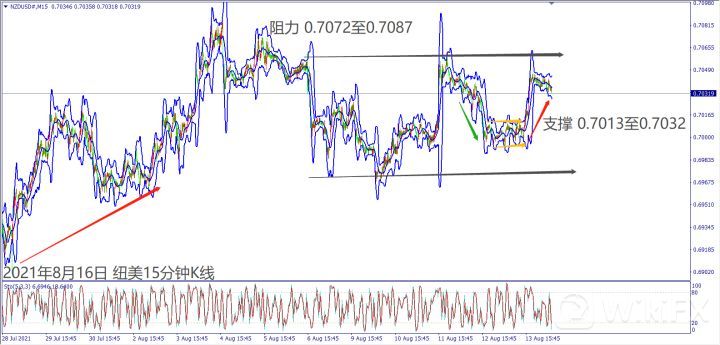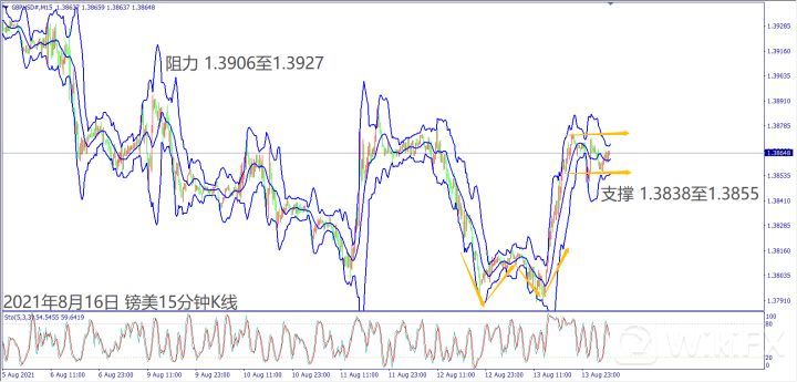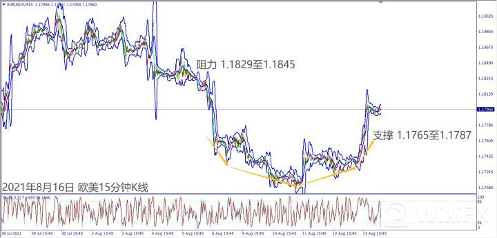 日级别线图,长阳烛收复一周跌势,5日均线上弯,有望延续反弹涨势;15分钟K线,出现圆形底反转,一旦突破1.1800关口,有机会挑战上方阻力。