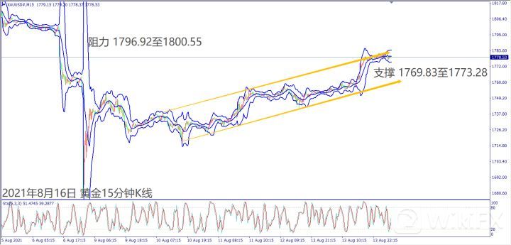 日级别线图,连续上涨出现V型反转,一旦突破1780美元,有望挑战1800关口;15分钟K线,短线出现上升矩形,守住形态趋势线,大有可能挑战前高阻力。