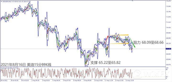 日级别线图,连续下跌出现倒V反转,5日均线冲不过,可能延续跌势;15分钟K线,短线出现箱型反转,68美元形成盖头反压,大有可能下探前低支撑。