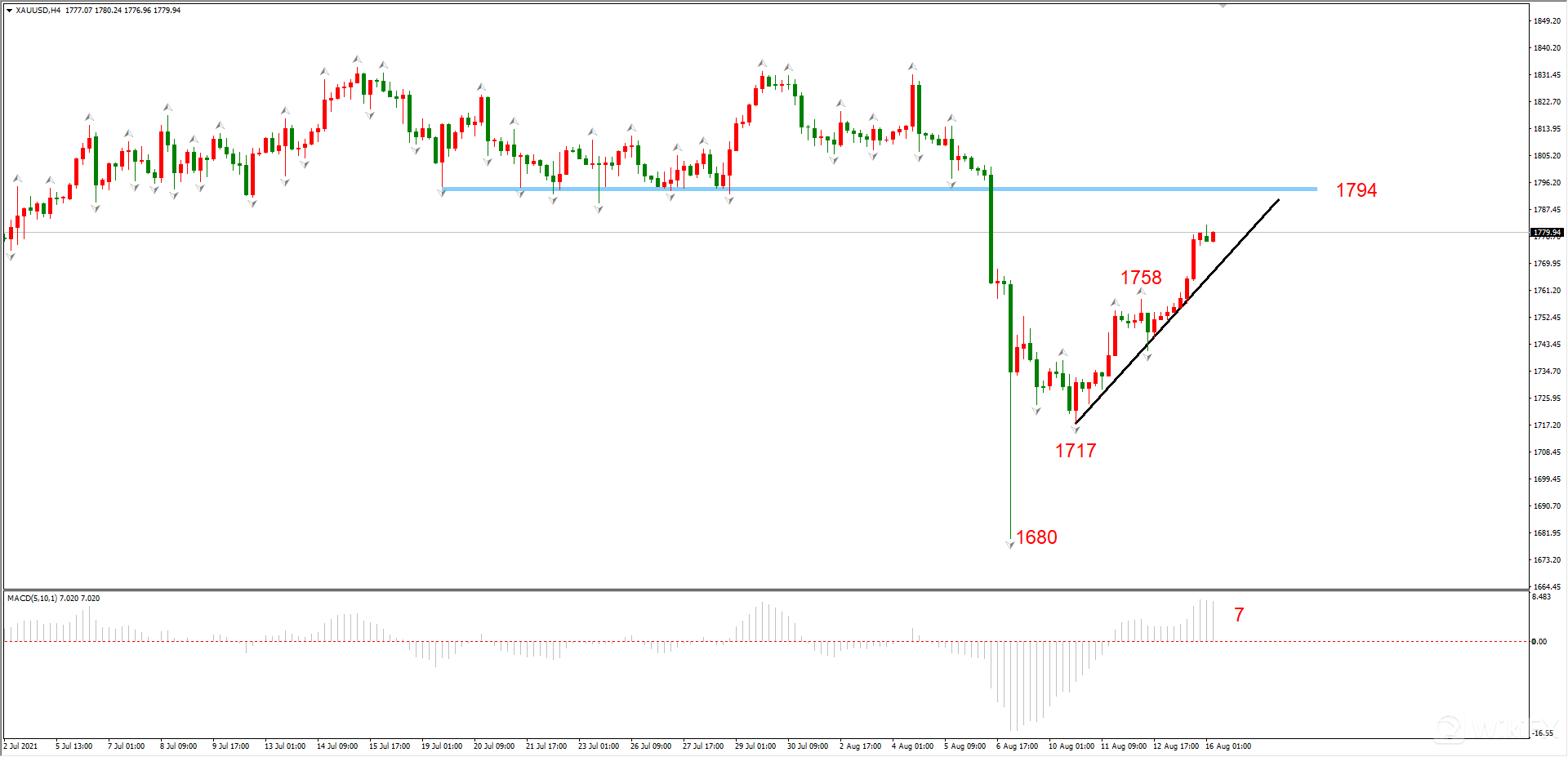 结构上看,反弹格局形成,后市将沿着图中上涨趋势线运行,短期目标位1794;