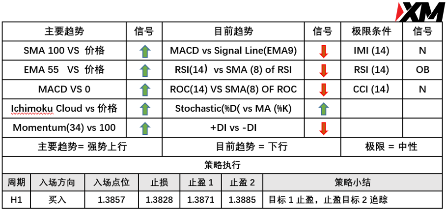 入场价位:1.3857,止损价位:1.3828,止盈目标一:1.3871,止盈目标二: 1.3885。