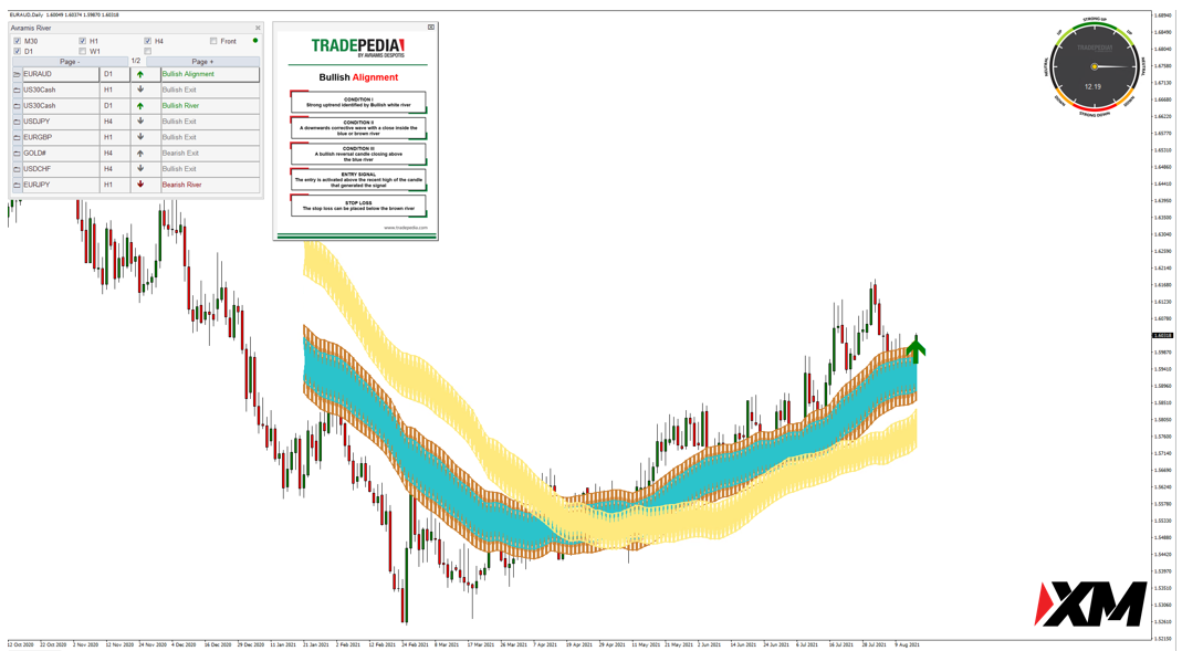 系统显示欧元兑澳元 EURAUD D1 级别出现了看涨排列的信号。