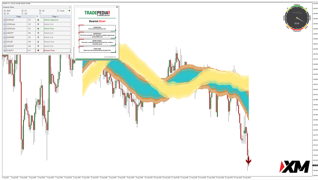 系统显示欧元兑日元 EURJPY H1 级别出现了看跌河流的信号。