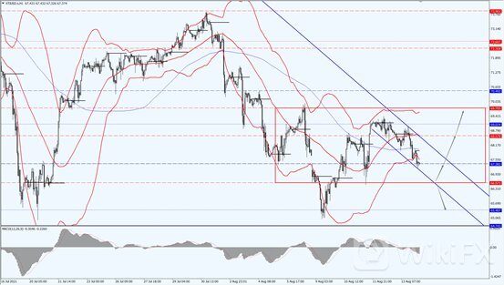 油价依旧处于 66.57 到 69.75 区间的横盘震荡阶段,应继续关注油价对 66.57 到 69.75 区间的突破方向,如果向上突破 69.75 一线,则将打开进一步的上行空间,届时依次 70.49 和 72.30 两个位置的压制力度;如果向下跌破 66.57 一线,则将打开进一步的下行空间,届时将再次测试 65.40 一线的支撑力度。在震荡区间内部,应依次关注 67.38 和 66.57 两个位置的支撑力度,上方依次关注 68.57 和 69.75 两个位置的压制力度。