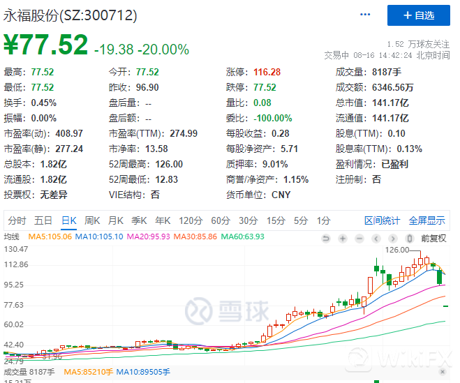 锂电产业链大幅杀跌,近期最火的赛道储能板块走弱,永福股份20%跌停,该股自去年2月初至目前股价已涨10倍。消息面上,公司遭股东宁德时代减持超5亿,在上日跌逾13%后,今天一开盘就20%一字跌停。