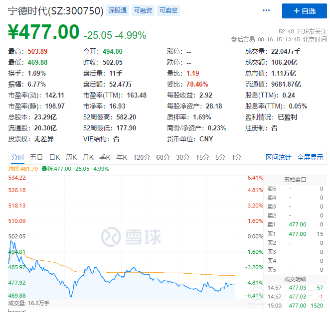宁德时代盘中跌幅一度扩大至6%,股价创近1个半月新低,