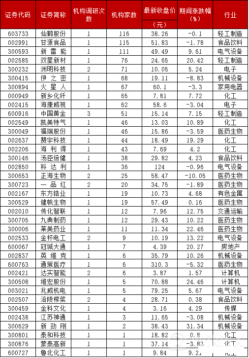 在41家机构调研的上市公司,获得超20家机构扎堆调研的上市公司有仙鹤股份、甘源食品、新雷能、双星新材、洲明科技、伊之密、火星人、新乡化纤、海康威视、中国黄金、凯美特气、福瑞股份、赞宇科技、海利得、汤臣倍健、科达利、正海生物、一品红共18家,其中仙鹤股份、甘源食品、新雷能三家企业最受机构青睐,扎堆调研均超过100家。