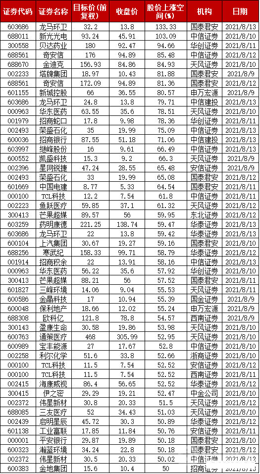 券商目标价有超50%上涨空间名单: