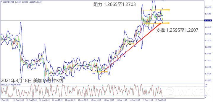 日级别线图,连续上涨出现圆形底反转,守住1.2600关口,有望延续涨势;15分钟K线,短线形成盘涨,一旦突破盘整顶部,有机会挑战前高阻力。