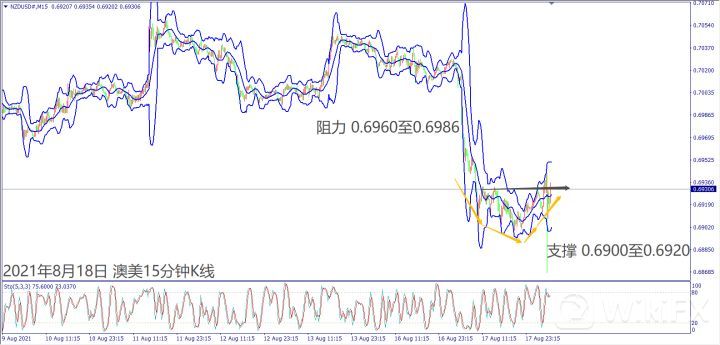 日级别线图,长阴烛回测盘整底部,跌破颈线形成M头,可能延续跌势;15分钟K线,短线出现圆形底,一旦突破0.6930,有机会反弹挑战上方阻力。