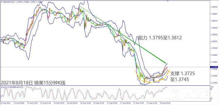 日级别线图,长阴烛掼破三周低点,5日均线反压,可能延续跌势;15分钟K线,短线出现圆形底反转,守住1.3740,有机会反弹挑战起跌阻力。