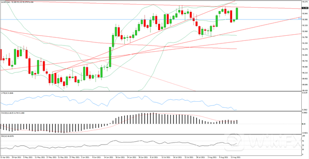 8月17日美元指数一度上涨0.6%,为8月6日以来最大涨幅,美元受到月度对冲和再平衡资金流的支撑,也受到风险基调恶化之际模型账户对高贝塔货币卖盘的提振,在美国经济数据显示出复苏不均衡之后,美元兑所有主要发达市场和新兴市场货币受月中的投资再平衡资金流动的影响都延续了涨势。