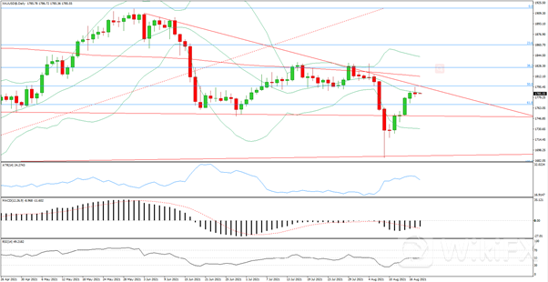 现货黄金尾盘下跌0.07%,至每盎司1786.19美元,此前曾触及8月6日以来的最高点1795.51美元。金价周二从一周多来的高点小幅回落,因一些投资者转而选择美元避险,感染新冠病毒DELTA变种的病例激增对全球经济复苏构成威胁。美元走强给黄金带来了一些压力,美债收益率给黄金提供了些许支撑,且在不加息的情况下通胀率上升的可能性增大。