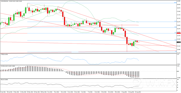 日线级别上方受到斐波23.6回撤和下行趋势线阻力,走势疑似向下突破回踩,MACD下行动能减弱,RSI从超卖状态回复。4小时级别踩住布林带中轨窄幅震荡上行,上方受到斐波23.6回撤阻力,布林带口收窄,MACD上行动能临近结束,RSI跌破50轴线。