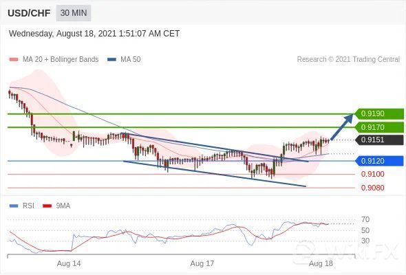 交易策略:在0.9120之上,看涨,目标价位为0.9170,然后为0.9190。