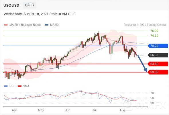 交易策略:在70.20之下,看跌,目标价位为63.10,然后为59.90。